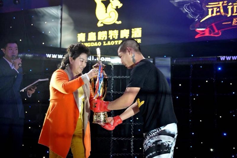 青岛崂特啤酒有限公司董事长邢慧女士亲临青岛时代星动力健身俱乐部武道风云MMA综合格斗狮选拔赛的现场,为选手呐喊助威,并为擂主颁奖。